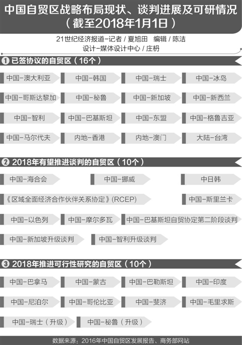 在近日的全國商務工作會議上,21世紀經濟報道記者從商務部國際司司長張少剛處獲悉,2018年中國將有10個自貿協定推進談判,還有10個自貿協定推進可行性研究。2017年中國新簽了四個自貿協定:中國分別與格魯吉亞、馬爾代夫簽署了自貿協定,與智利簽署了自貿區升級議定書,還簽署了優惠貿易安排性質的《亞太貿易協定第二修正案》。